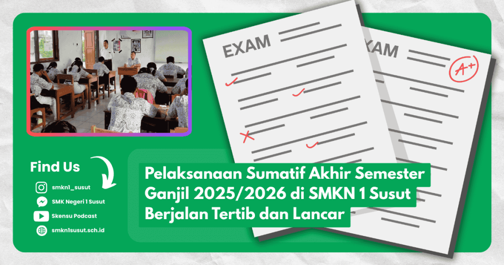 SMK Negeri 1 Susut melaksanakan kegiatan Sumatif Akhir Semester (SAS) Ganjil Tahun Ajaran 2025/2026 selama empat hari, terhitung mulai tanggal 8 Desember 2025. Kegiatan asesmen ini merupakan bagian penting dari proses evaluasi pembelajaran untuk mengukur capaian kompetensi murid selama satu semester. Sejak awal pelaksanaan, suasana akademik di lingkungan sekolah tampak tertib, kondusif, dan penuh keseriusan. […]